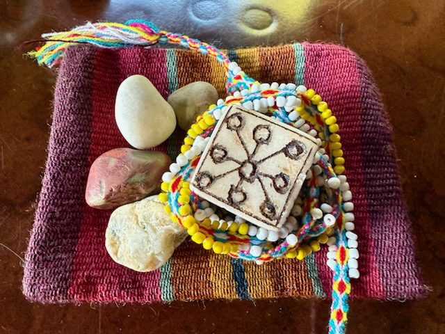 Medicine Die – archetypal images help reflect and direct your work – discover the Andean Energy of the moment. Divination stones and a colorful beaded tie complete this essential set for your Medicine Bundle explorations.