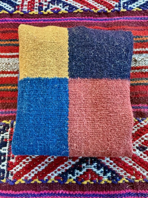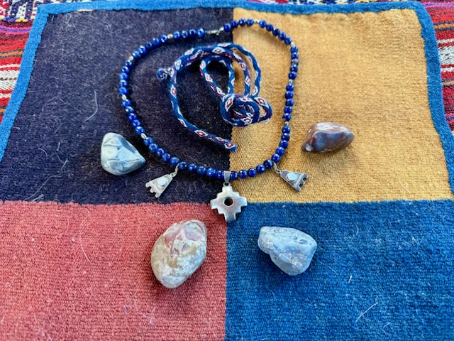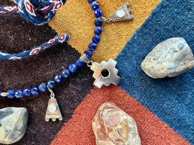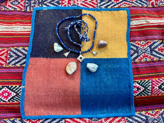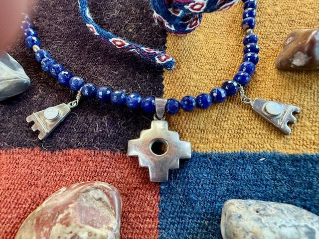 fabric. Blue is the favorite color of Nilda CallaƱaupa, Director of the Center for Traditional Textiles in Cusco, Peru. Nilda would be proud of this four-quarter cloth woven by a member of the Center and matched with a Chacana necklace and four sacred stones, one for each of the quarters of the Inka realm. This cloth, matching chacana necklace and Nawe tie is a rare find and a delight.