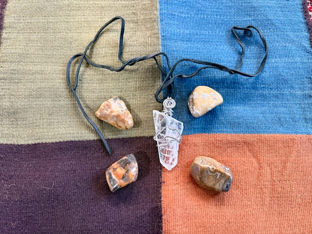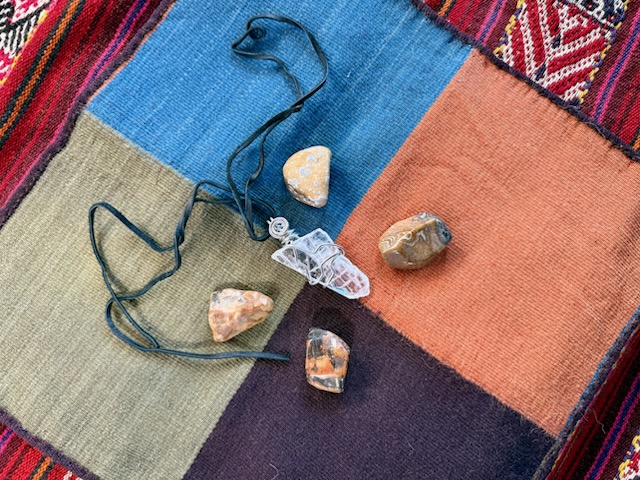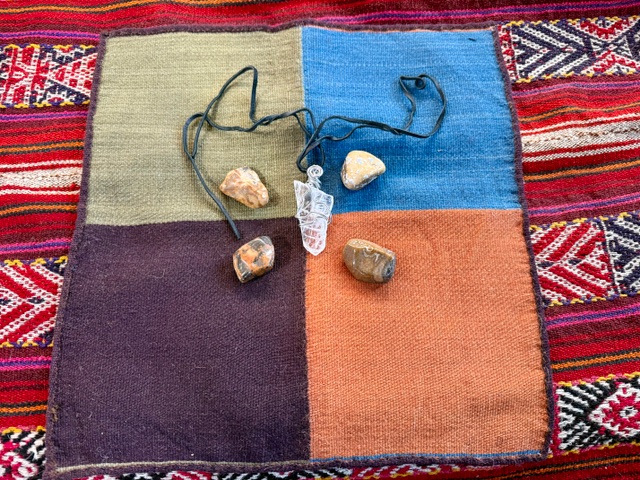 of the finest weavings of the Andes. This piece is no exception. Hand-woven, naturally dyed, and made in the sacred form of four parts, together, the Andean Tawantinsuyu. As an enhancement to the cloth is its four stones, one for each suyu. And accompanying the set is a  Crystal pendant to bring crystalline energy to your palette.