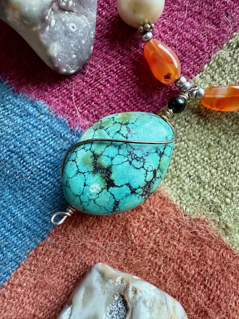provides a base for exploration. Upon the cloth resides a compatible turquoise necklace in rainbow colors and a stone, one for each suyu: Antisuyu, Collasuyu, Kontisuyu, Chinchaysuyu.