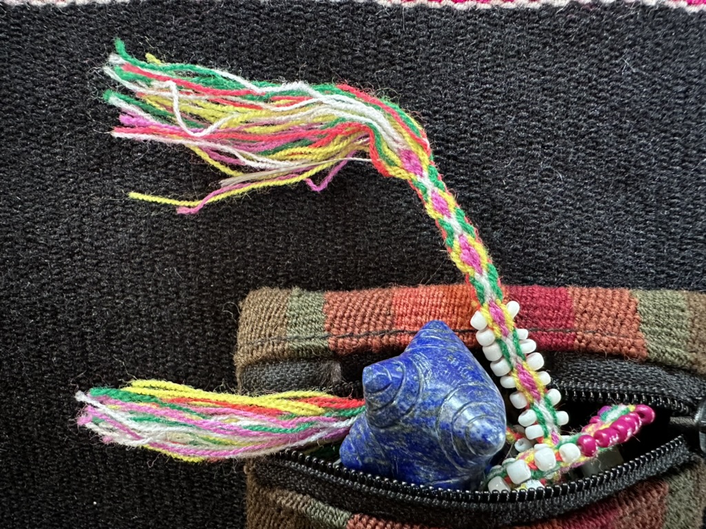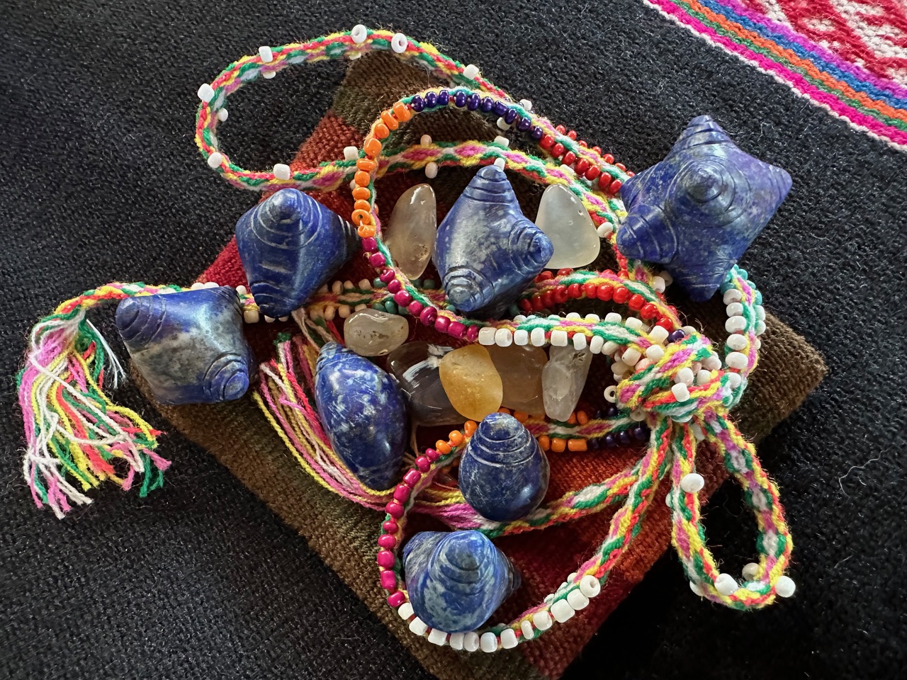 A Chumpi Celebration, this set radiates joy. Arturo, the master sacred carver in Cusco, crafted these stones in his rooftop studio. Covered in the dust of the apus, Arturo takes special care to craft each stone by hand. This seven stone set dances among collected Pacific Ocean agates and is accompanied by a brightly colored beaded rainbow tie. The Chumpi Family is wrapped in a hand-dyed and woven zip bag from the Center for Traditional Textiles. Enjoy!