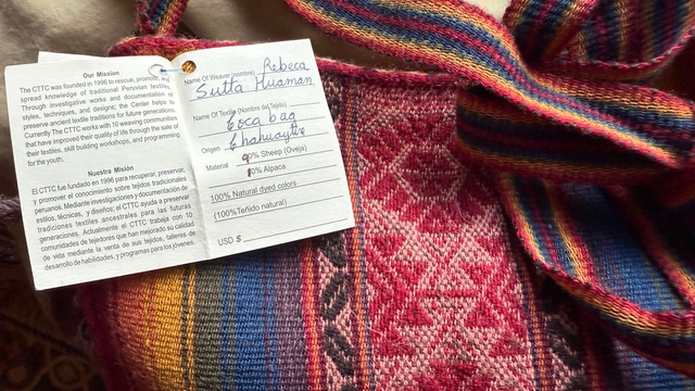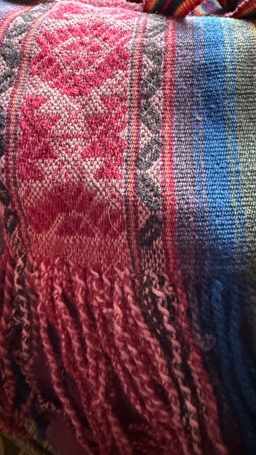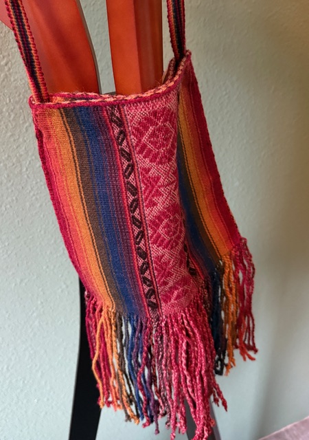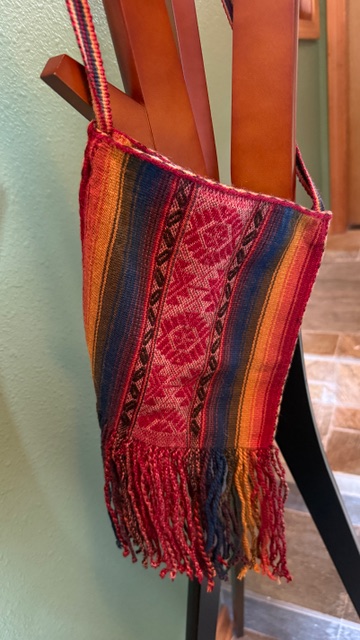 Beautiful Hand woven shoulder bag with 44″ strap, 6″ fringe and measures 8″ x 8″.  Rainbow colors make this bag unique.