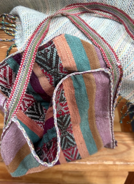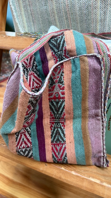This bag is 11″ x 12″ with a 34 inch strap.  Lavender, peach, teal and purple stripes make this a versatile all around bag.
