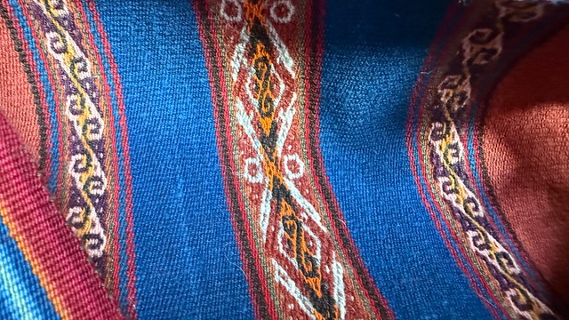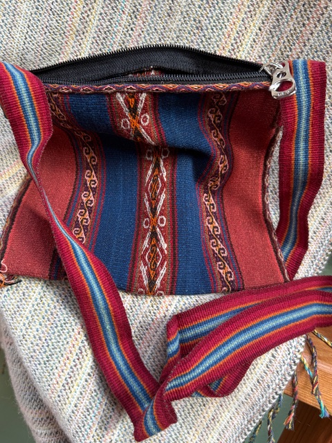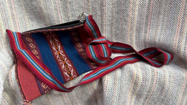 Beautifully woven shoulder bag with 44″ strap.  This bag measures 8″ x 9″ Colors are rust and bluejeans blue.