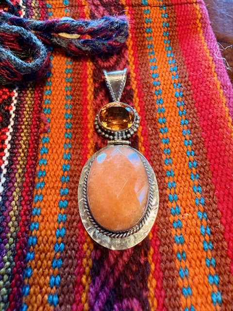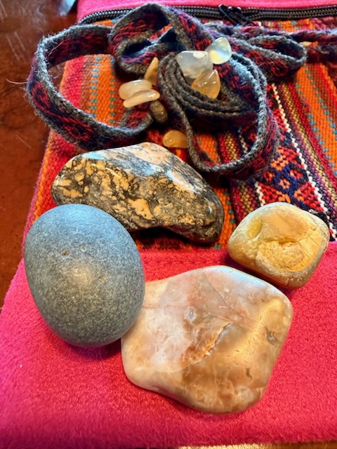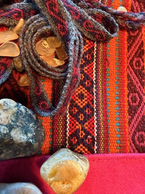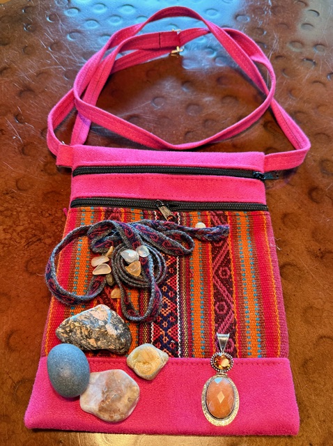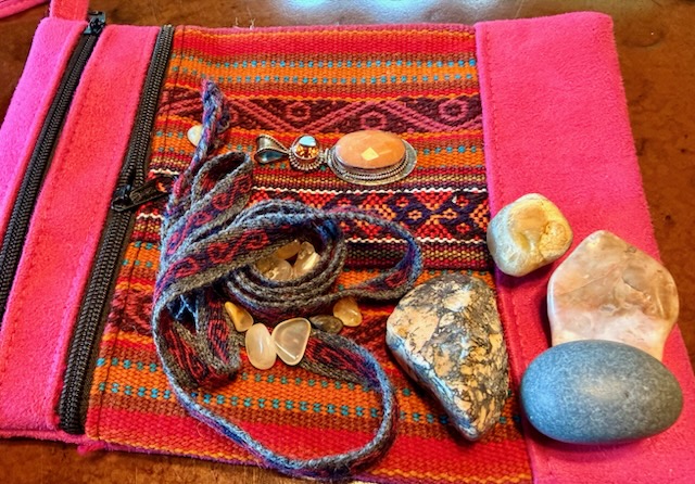 necklace, collected stones, a woven tie, and whatever additional treasures